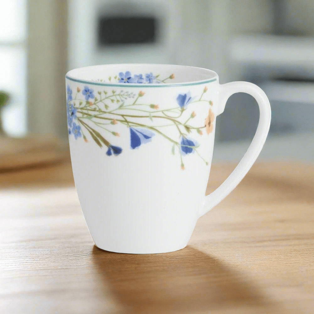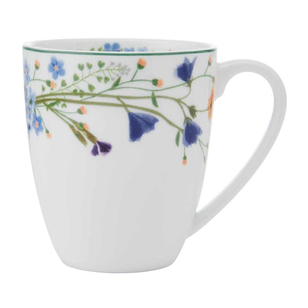 This Quinn Mug features a vibrant blue, orange, and purple floral design on crisp white bone china. Add a touch of elegance to your morning routine. Made of high quality bone china, this 12-ounce mug exudes sophistication and durability.